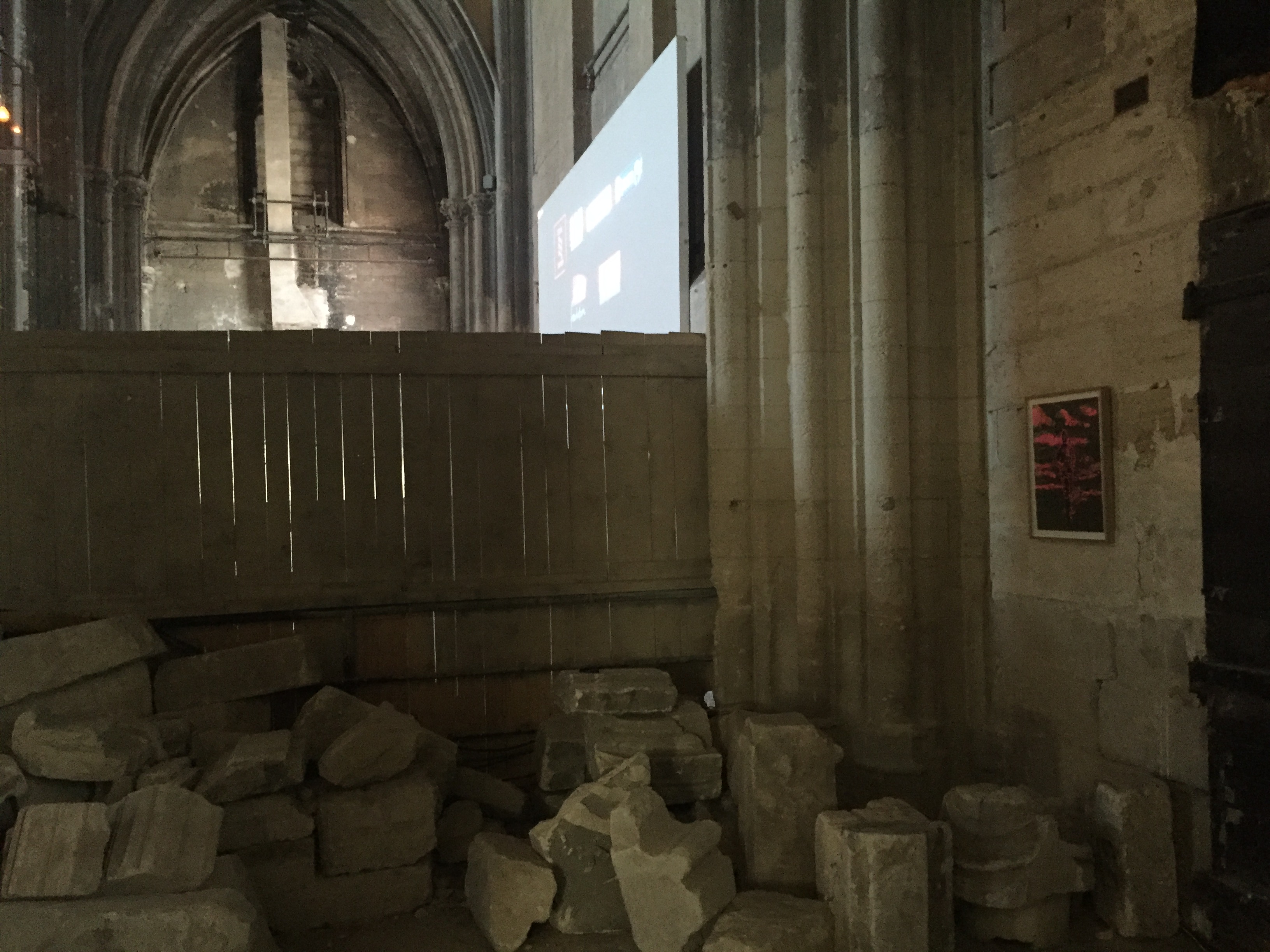 Il faut parler du lieu d’abord, qui est sublime jusqu’à la suffocation. On rentre dans une église en désordre, et c’est déjà toute une allégorie. On ne sait pas où on est, face à ces pierres : transept, nef, chœur, tout est au sol dans la poussière. Il est midi. Le soleil frappe partout à la fois. Le silence est aussi profond que les tombes sous nos pieds. Il n’y a personne : personne ne sait qu’ici se joue le plus beau théâtre du festival d’Avignon. Il n’y a qu’à regarder les pierres : elles jouent à la perfection le rôle que l’Histoire leur demande, jusqu’à la désobéissance. La fable est devant nous comme une bête crevée, le ventre ouvert. On marche ici en faisant de tels rêves : que faire d’autres ? Il y a dans ce qui reste de la nef les images de vidéos qui documentent en direct le festival : elles sont déjà périmées. On préfèrent rêver aux animaux morts et aux pierres effondrées, aux architectures jadis levés dans la certitude qu’elles dépasseront l’éternité et qui gisent entre nous : devenir du passé. À la fin, c’est la jungle qui gagnera, et la poussière.