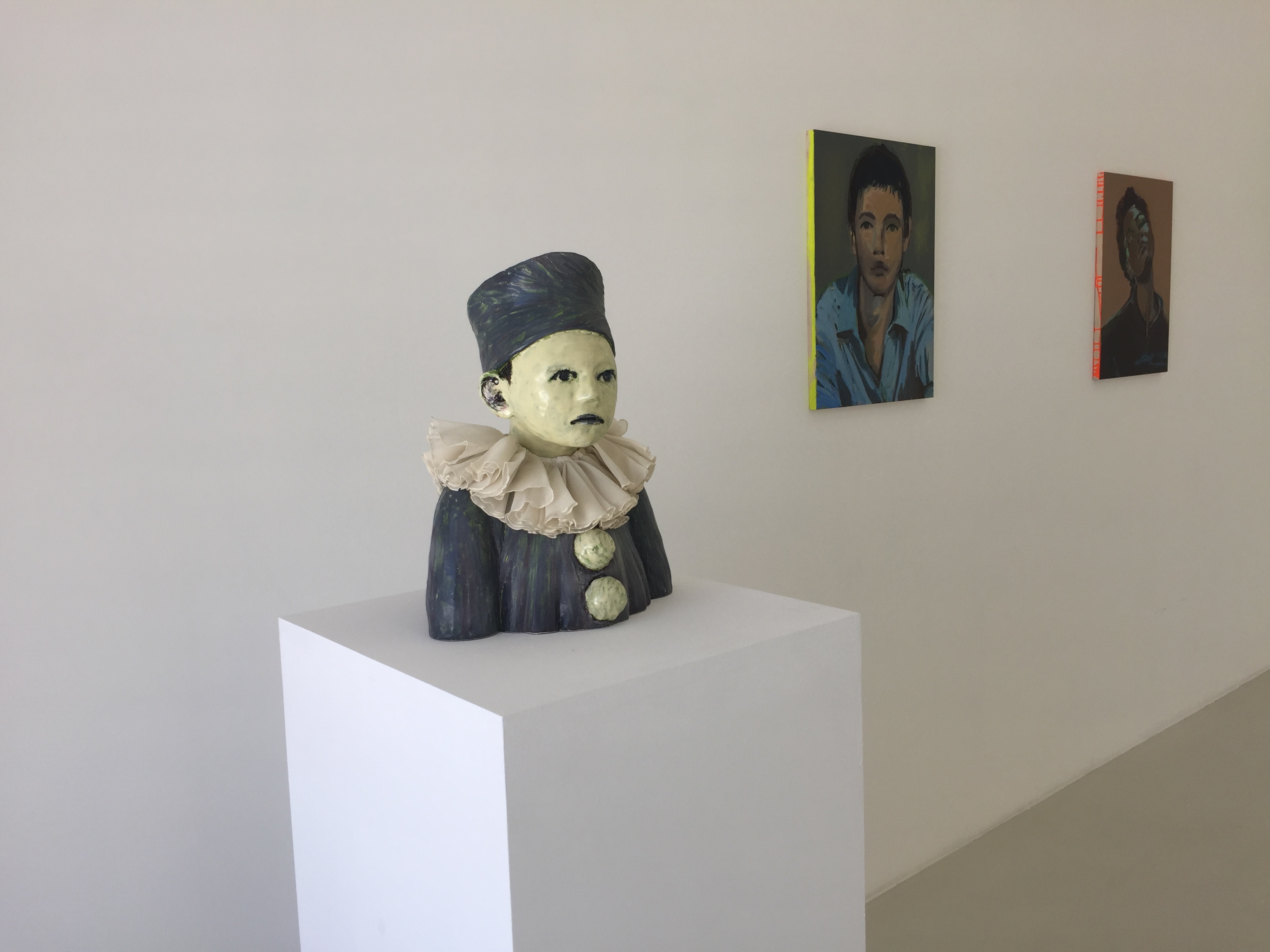 Face à ces tableaux vengeurs (mais de quels crimes ?), des bustes en céramiques sont posés. Et les jeux de regard se redoublent. Les toiles regardent les bustes qui les regardent : et nous au milieu, regardons moins les œuvres que ces regards qui se croisent à l’exact endroit où nous sommes.