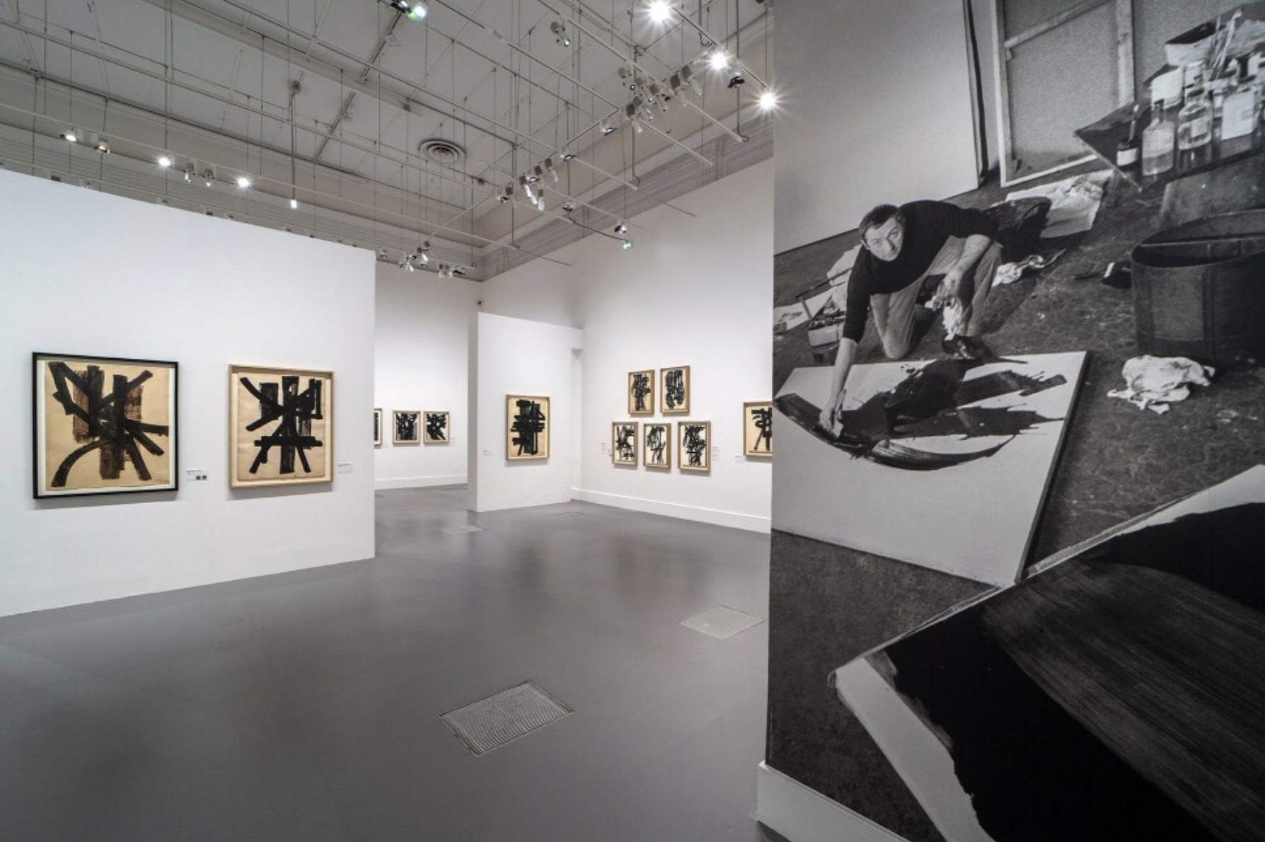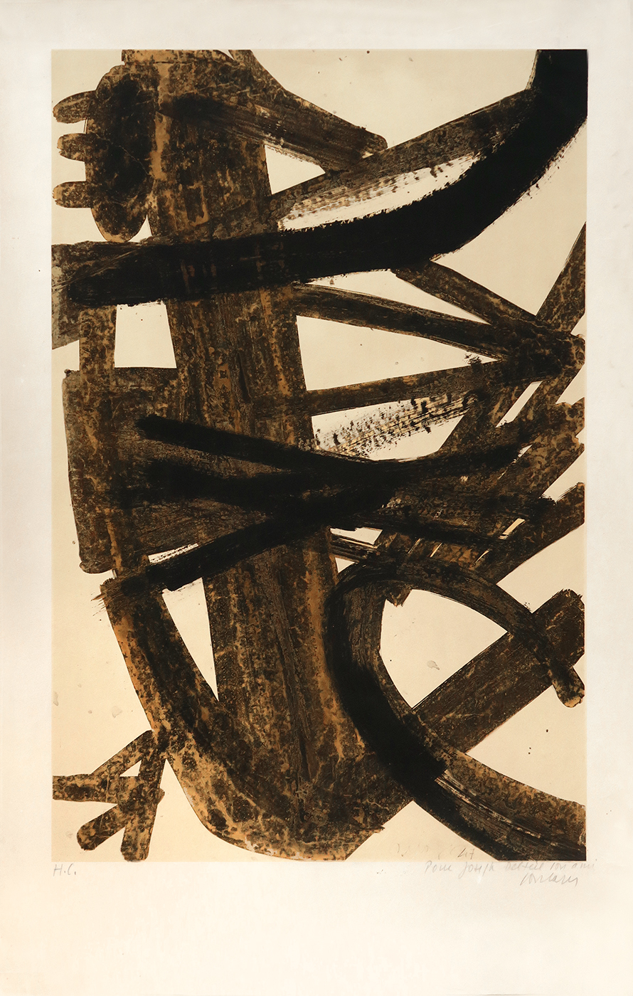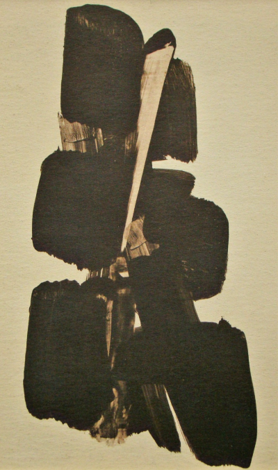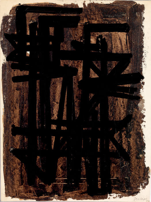 Marge du travail sur toile, ou laboratoire central ? Le papier reste le lieu où s’exercent les plus grandes violences : variantes dans l’usage du brou — couches épaisses, coups de brosse horizontaux et verticaux, alternance mat / brillant. C’est aussi sur papier que débutent les lithographies dès 1952 — noires, puissamment contrastées, réalisées avec l’imprimeur Fernand Mourlot à Paris.