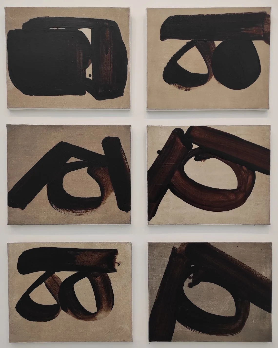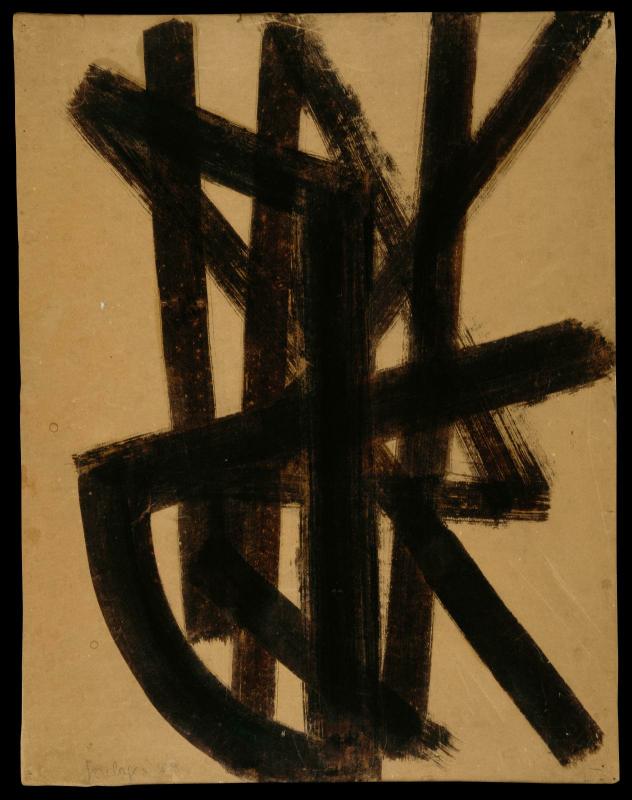Des sortes d’idéogrammes. Dessins furieux qui révèlent des lois secrètes : celles qui brisent le récit d’un tracé pour proposer un événement de forme, force toujours présente en chacun de ses points. Lignes de fuite ; lignes d’erre — sans destination et intensément dirigées. La ligne cesse d’être trajectoire, devient pression, contraction, impulsion. es premières peintures sur papier au brou de noix forgent un langage radical qui déterminera les décennies suivantes : gestes larges, contrastes brutaux, économie de moyens.