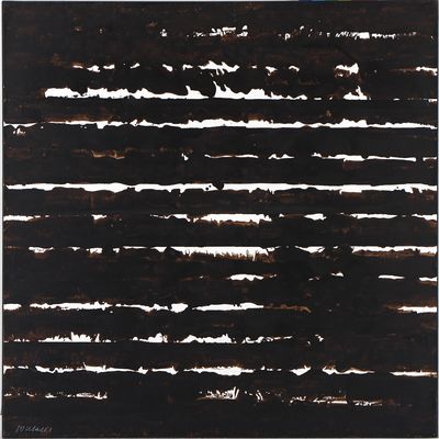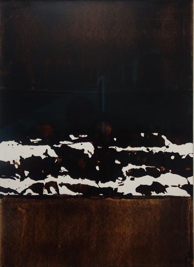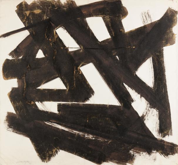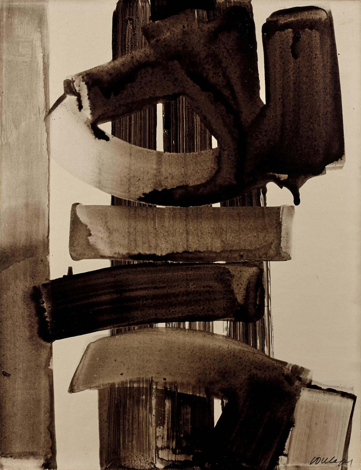 1963 : cette œuvre monumentale sur papier — Brou de noix sur papier, 130 x 202 cm — dimensions exceptionnelles qui imposent au papier une présence d’ordinaire réservée à la toile. Pièce rarement montrée, fragile, qui témoigne de l’ambition : faire du papier non un support mineur mais un territoire pictural à part entière.