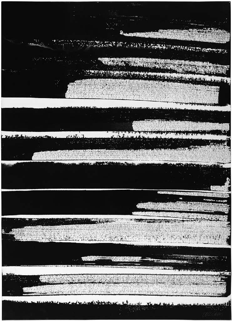 Les papiers des années 1950 deviennent plus architectoniques, striés de grandes bandes noires découpées par des obliques massives — compositions tendues, rêches. Apparition aussi de contre-formes lumineuses, zones blanches préservées par le geste, et on ne sait plus ce qui est menacé par quoi, ce qui est le plus terrible : l’intact ou le maculé, le blanc ou la couleur, ce qui est le contre-fort de l’autre.
