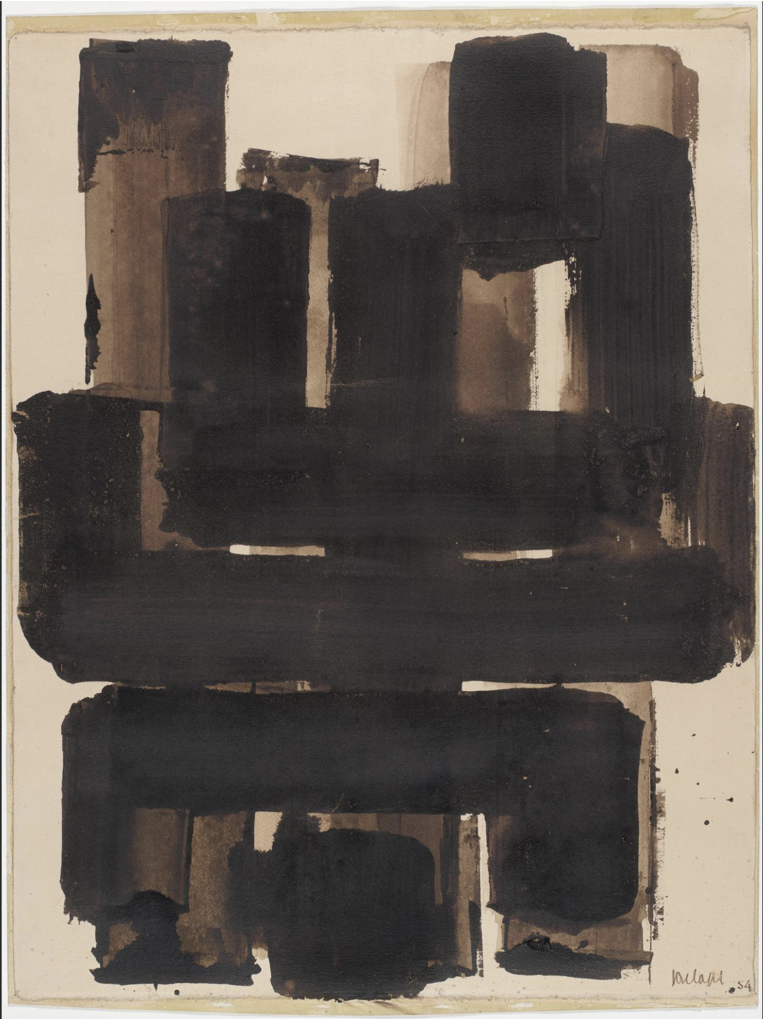 La guerre s’achève. Pierre Soulages est reçu aux Beaux-Arts de Paris, refuse de s’y rendre — il sait qu’il se trouvera en désaccord avec l’académisme qui y règne encore. Il s’installe à Montpellier avec Colette, qu’il vient d’épouser — choix de la marge, de l’écart, loin des circuits obligés. Il travaille des figurations abstraites : la forme ne peut plus être transcription docile d’un motif. Elle doit devenir acte, événement visuel qui surgit dans l’instant de sa propre nécessité. L’huile le contraint trop. Par impatience, rage, il jette sur du papier des lignes brutales au brou de noix avec des outils de peintre en bâtiment : là, ces lignes vibrent autrement sous ses larges brosses et ses racloirs.