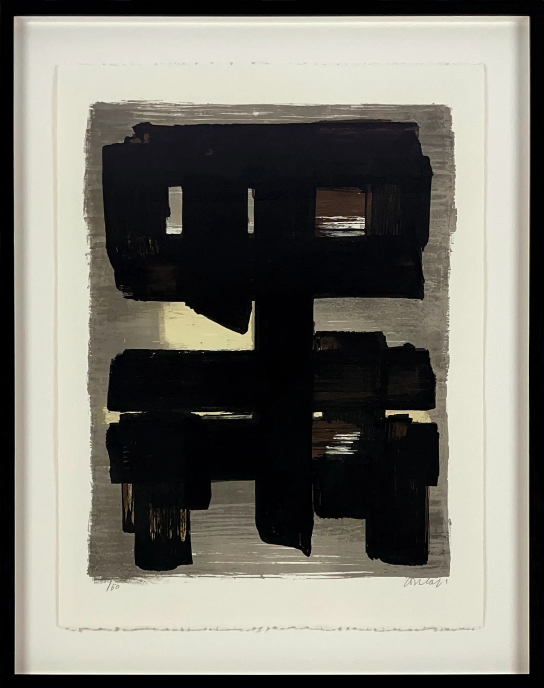 Soulages devient au-delà des frontières une figure de l’abstraction lyrique — terme qui désigne cette tendance de l’art abstrait français d’après-guerre : geste spontané, expressivité du trait, liberté gestuelle contre géométrie froide (Georges Mathieu, Hans Hartung, Pierre Tal-Coat). Terme qu’il récuse pourtant, refusant tout lyrisme pour revendiquer une rigueur constructive.
