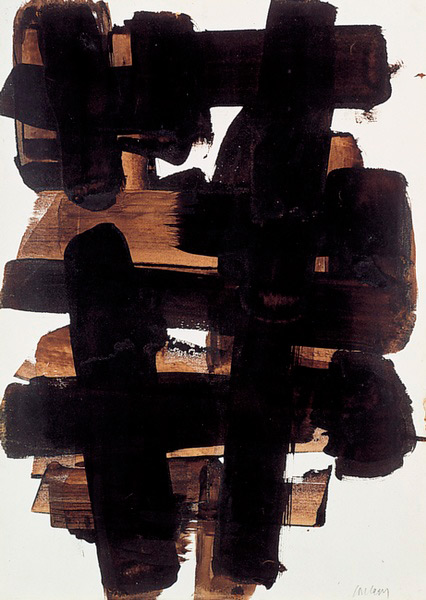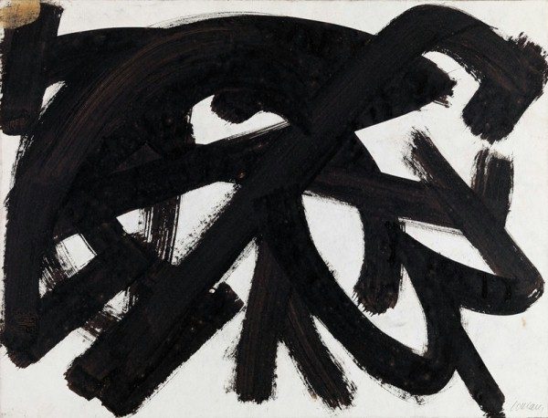 Une œuvre ne vit que de ses déplacements violents. Soulages abandonne presque aussi rapidement qu’il les avait accueillis ces réseaux de lignes fines, trop hantés encore de ces arbres d’hiver, aussi bien que les graphes fibrés, ramifiés, sculptés dans la rage. Il privilégie la ligne large et le geste épais, la forme-bande articulée à des rapports de masses sombres : comme s’il voulait éviter à tout prix le « dessin » (et à quel prix) pour mieux se livrer à la construction par traces.