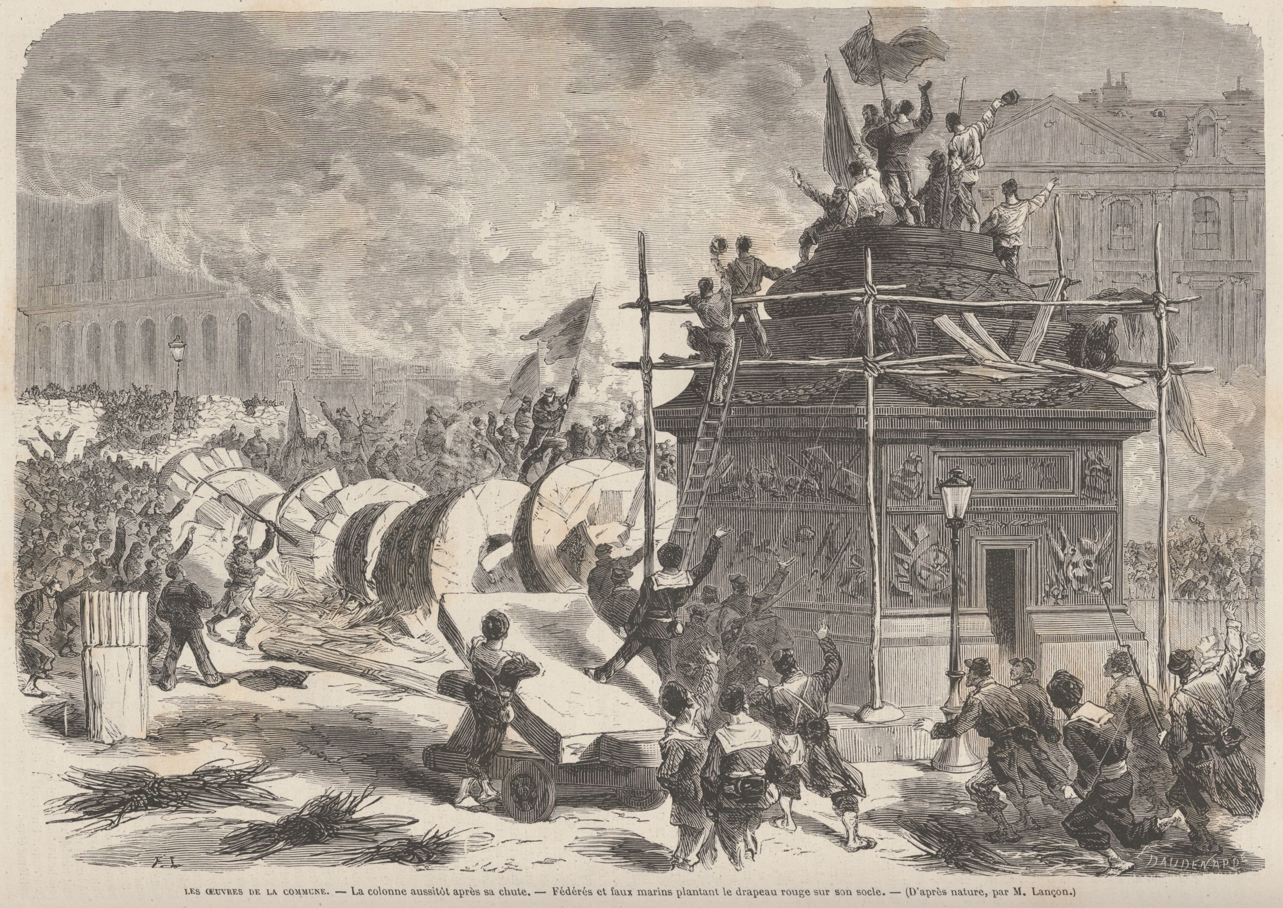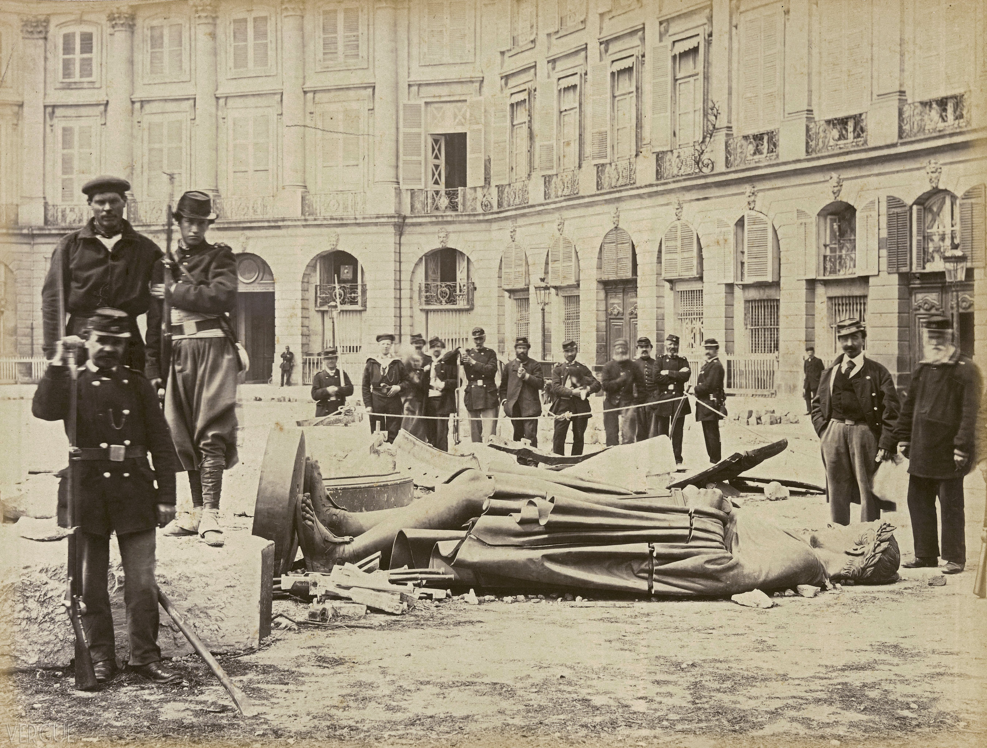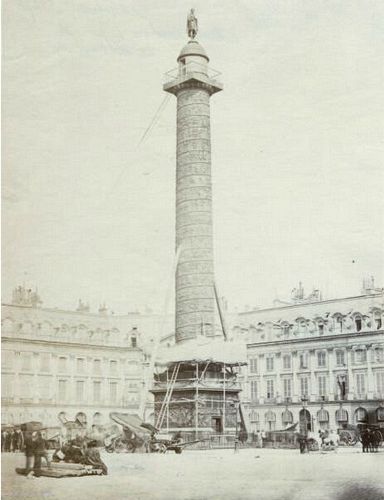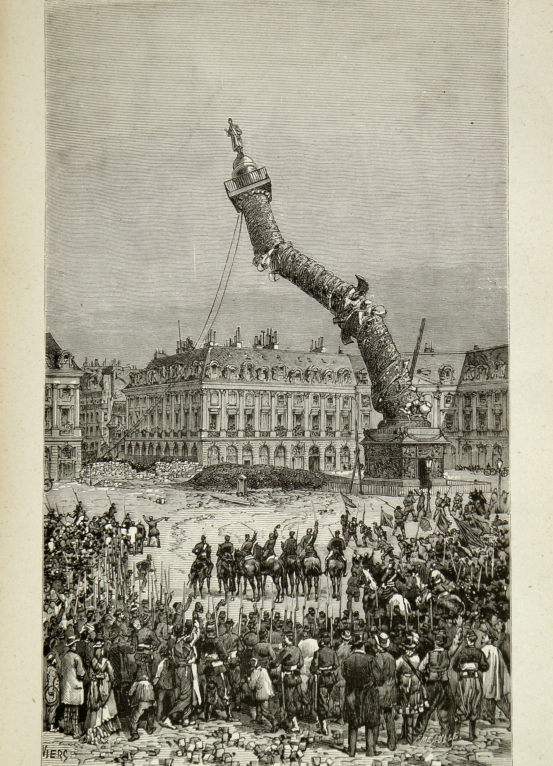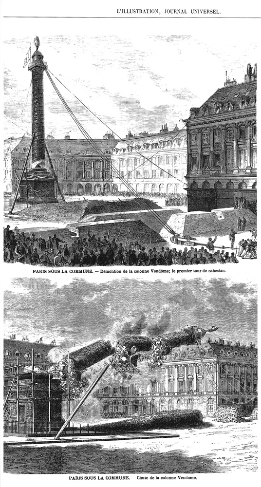 Nous sommes mardi. C’est le 16 mai. Depuis le matin, une foule s’assemble place Vendôme. Par décret du Douze avril, le gouvernement révolutionnaire a décidé en son article premier paru dans le Journal Officiel de la nouvelle République la destruction de la colonne impériale, « monument de barbarie, symbole de force brute et de fausse gloire, affirmation du militarisme et négation du droit, insulte permanente des vainqueurs aux vaincus, attentat perpétuel à la fraternité. »