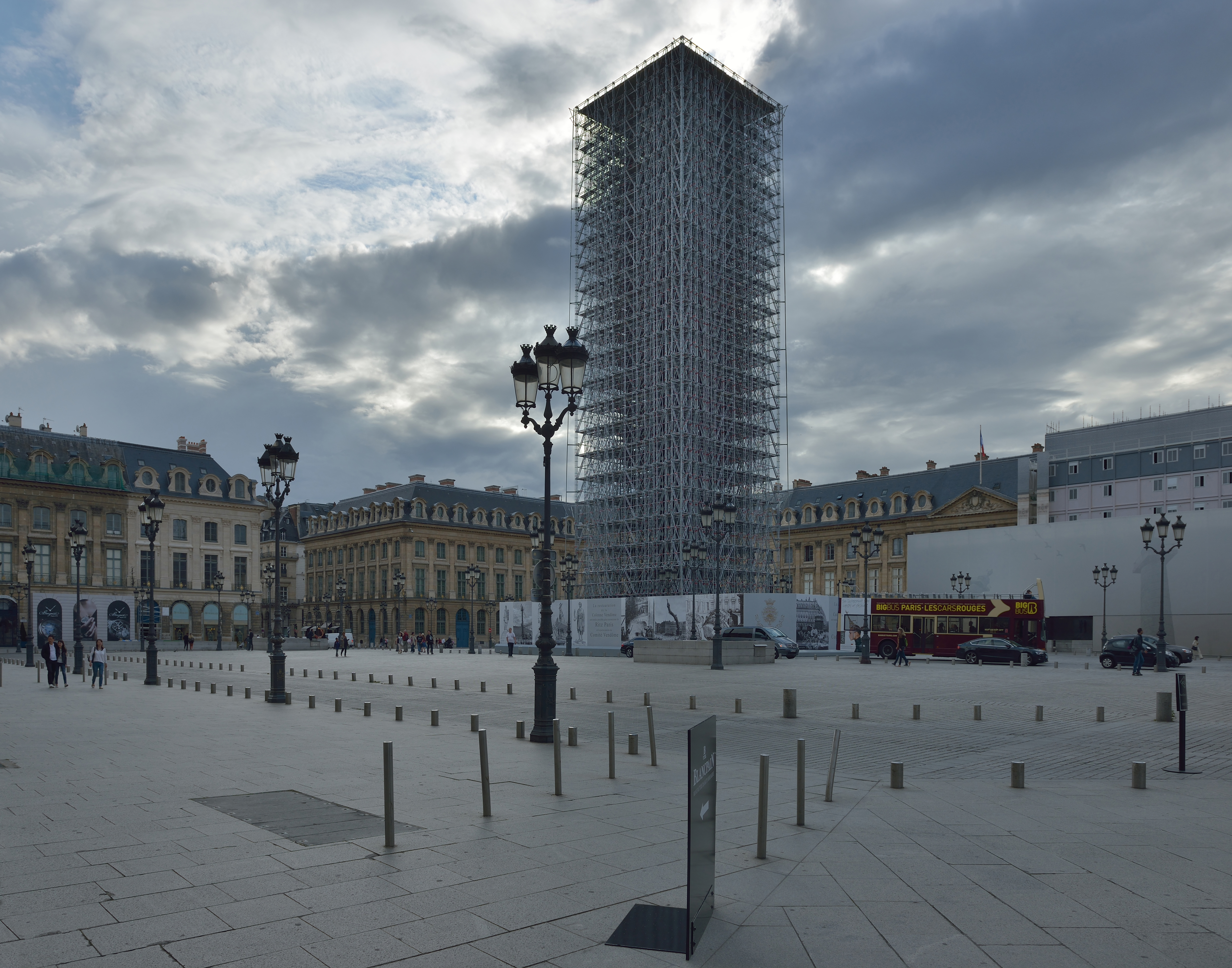 Marcher vers la Place Vendôme donne ce sentiment stupide d’être désarmé. Après avoir écrasé les Communards, la République ordonna la reconstruction de la colonne aux frais de Courbet qui avait émis l’idée de sa destruction. Deux ans plus tard, elle dominait de nouveau la place redevenue Vendôme après avoir été, près de deux mois communarde et nommée Place Internationale. On orna la colonne d’une autre statue de l’Empereur drapé dans un manteau court et portant pour attributs de sa gloire le glaive, la victoire ailée et la couronne impériale de lauriers : c’est elle qui trône encore sur le ciel de Paris, gouverne nos jours et ces nuits.