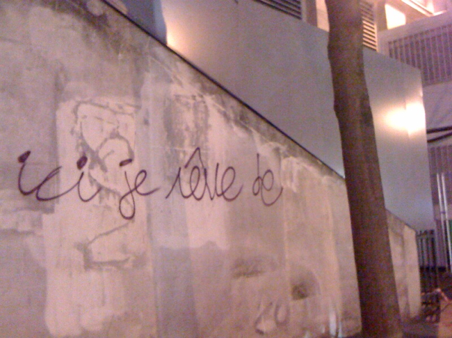 Sur le mur de la ville, tout l’espace manquant du rêve : ce qu’il appelle. Tracées à la main, les lettres. La phrase incomplète, croit-on. Il y a un arbre après le mot — je veux dire : à droite dans la rue quand on regarde le mur, cet arbre qui prolonge la vision de la phrase. On pivote, et l’arbre disparaît, c’est toute la rue qui vient poursuivre la phrase. (Oui, poursuivre, comme tel corps aperçu dans l’éclat bleu de cette nuit, et qu’on essaie de rejoindre dans les couloirs de cette vie, en courant. Alors, non pas poursuivre comme des flics, mais comme des désespérés plein d’orgueil et finalement plein d’espoirs.). On pivote encore, c’est toute la vie qui vient inachever la phrase. J’aurais voulu me placer après le mot, et poser mon corps entre le vide et le mur. Peut-être est-cela que je fais, précisément, ce soir, cette nuit, ce matin, je ne sais plus. Peut-être que je fais l’inverse.