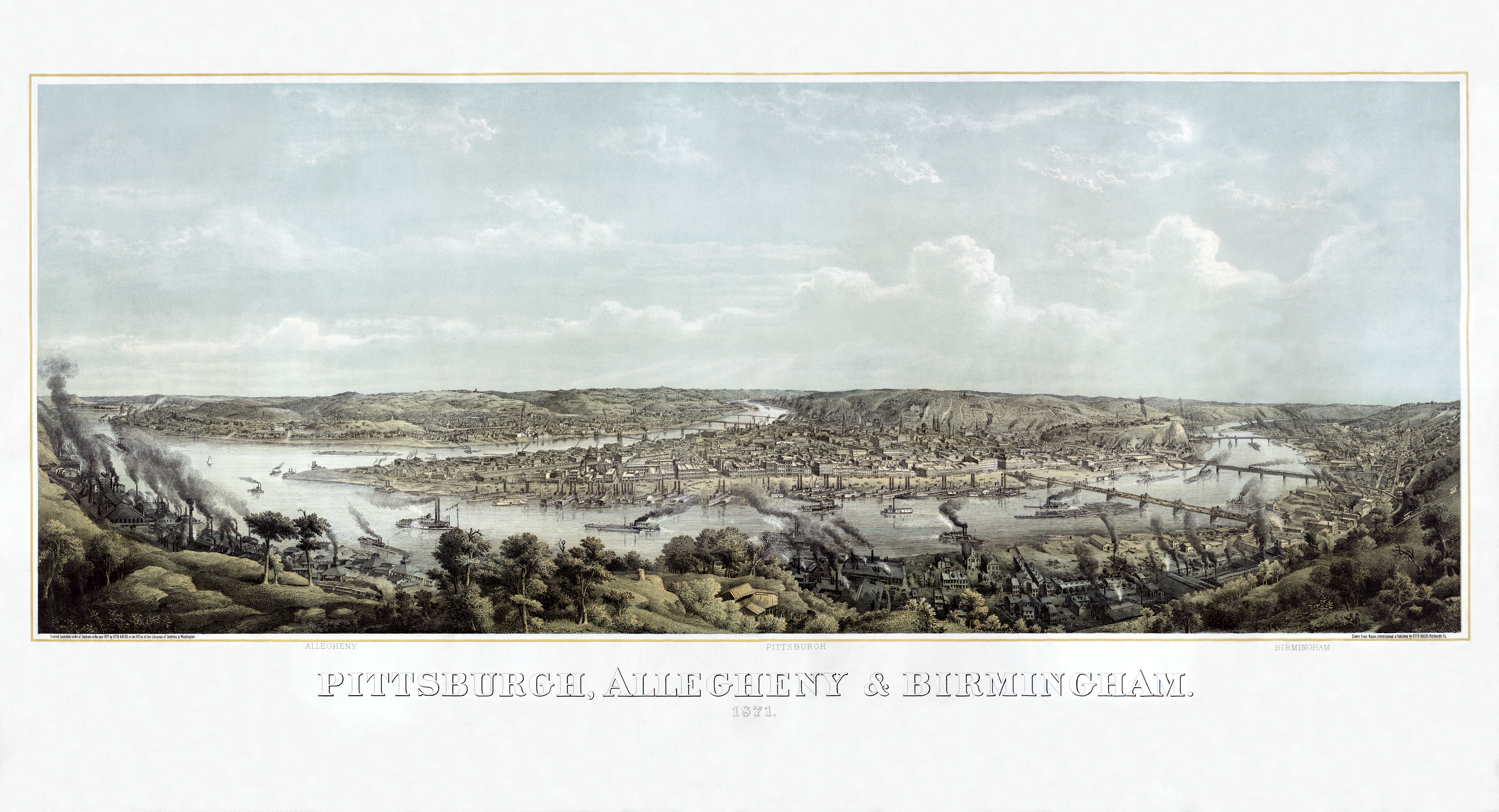 À la confluence de la rivière et du fleuve qui naît sous lui, les Français avaient bâti le fort Duquesne dès 1754 ; l’année suivante, le général Braddock, accompagné d’un jeune officier nommé George Washington, échoue à s’en emparer – mais les Français l’abandonnent après l’avoir tant défendu. En 1758, les Anglais reconstruisent sur les ruines le fort Pitt. La ville naît de la cendre et du combat. Au XIXᵉ siècle, fer, acier, charbon font de la région une matrice ardente : hauts fourneaux, ruisseaux incandescents, colonnes de fumée – le minerai tombe de la mine dans la fonderie et le feu retourne au ciel en panache noir. En 1907, Pittsburgh annexera Allegheny City et l’absorbe ; la ville dévore la ville qu’elle a enfantée, le nom disparaît pour ne baptiser que pâtés de maisons, square, un General Hospital et une High School délabrée.