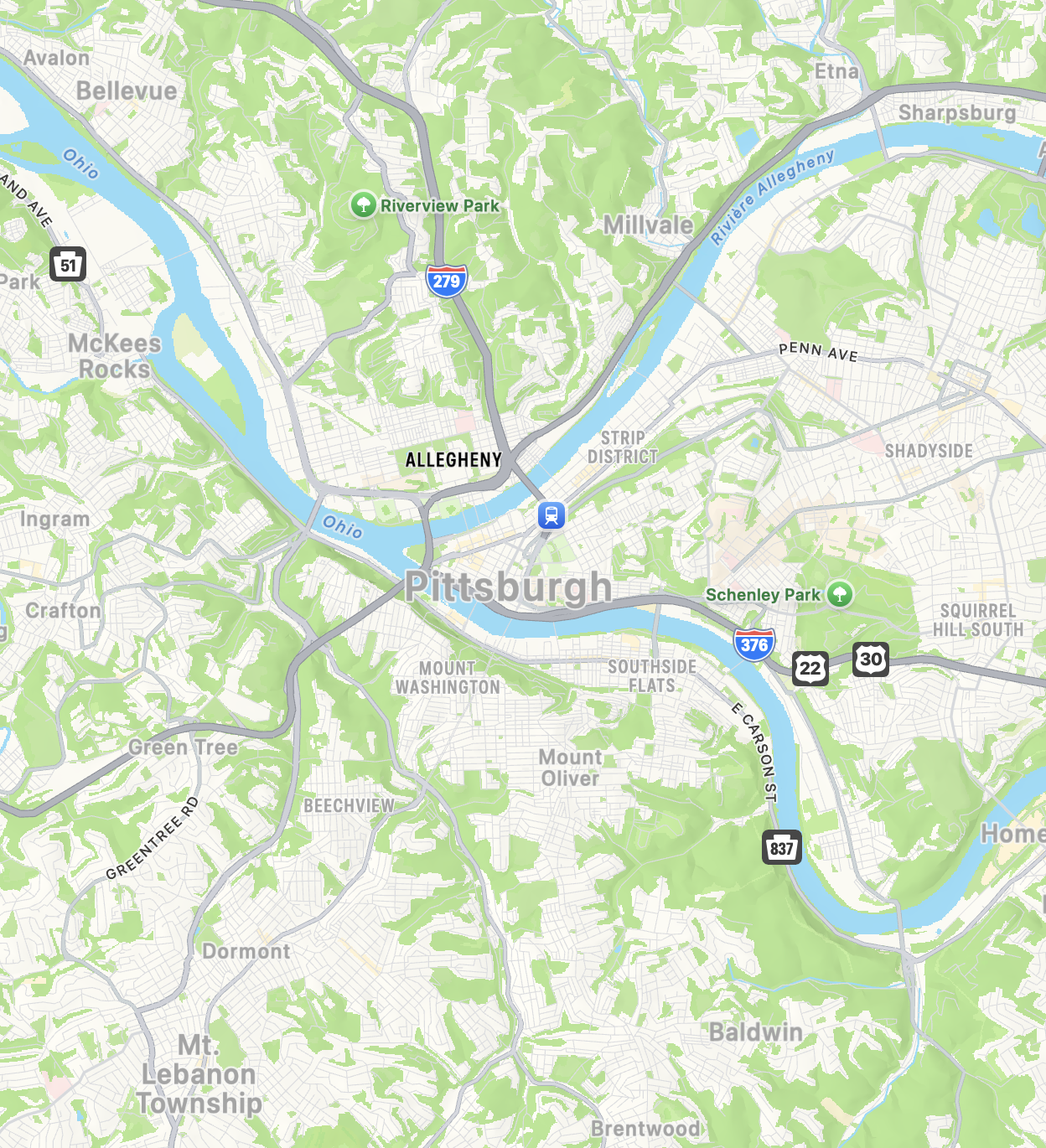 Il faut décidément se pencher sur la carte ainsi retournée, suivre du doigt où conduit cette Allegheny américaine, de sa naissance sur Cobb Hill, Potter County, au nord de la Pennsylvanie et descendant des forêts sombres du Allegheny Plateau pour frôler Coudersport, longeant Port Allegany et franchissant la ligne de New York State avant de traverser Olean, Salamanca, terres de la Seneca Nation, puis de s’élargir dans les eaux du Allegheny Reservoir, retenue par le Kinzua Dam et de reprendre vers le sud-ouest, coupant la Allegheny National Forest, Warren, la Conewango Creek et Tidioute, Tionesta, Franklin, puis recevant la French Creek à Oil City, mémoire du pétrole, et Emlenton, Parker, Kittanning, Ford City, Freeport, entrant dans la vallée industrielle, Tarentum, New Kensington, Oakmont et enfin les faubourgs de Pittsburgh – Highland Park, Lawrenceville, Strip District –, avant la pointe exacte du Golden Triangle, Point State Park, rejoignant alors la Monongahela River, d’où surgit soudain l’Ohio River — Pittsburgh Downtown, à l’ombre du Mount Lebanon, les « Monts Liban » du poème — qui sent moins le cèdre que le fer, montagne creusée de mines que gravie en effet un chemin de fer en colimaçon.