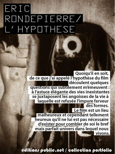 Attiré dès ses années de formation autant du côté du texte que de l’image, comédien, performer, c’est au début des années 90 qu’Eric Rondepierre commence à explorer les « angles morts » du dispositif cinématographique extrayant des photogrammes prélevés à la continuité fugace des séquences pour les donner à voir comme un monde caché du film. Rapidement cette activité se double et se complète de celle d’écrire : les livres d’Eric Rondepierre, mêlant la fiction à l’autobiographie et revenant avec insistance sur ses obsessions de plasticien, accompagnent et prolongent l’exploration de sa vie un peu comme on tâte dans l’obscurité les parois d’une pièce pour s’en figurer les volumes. Dans L’Hypothèse, livre réalisé à l’invitation de Publie.net, « L’auteur s’arrête quelques instants sur vingt ans de production photographique et contemple son œuvre. Une sorte de traversée narcissique du miroir qui est aussi une plongée à l’intérieur d’un film qui manque. »