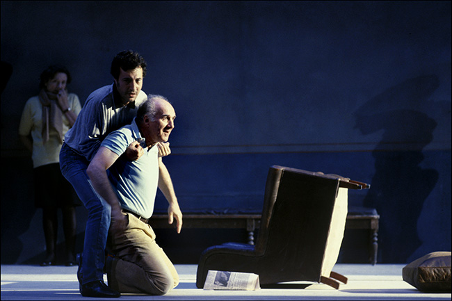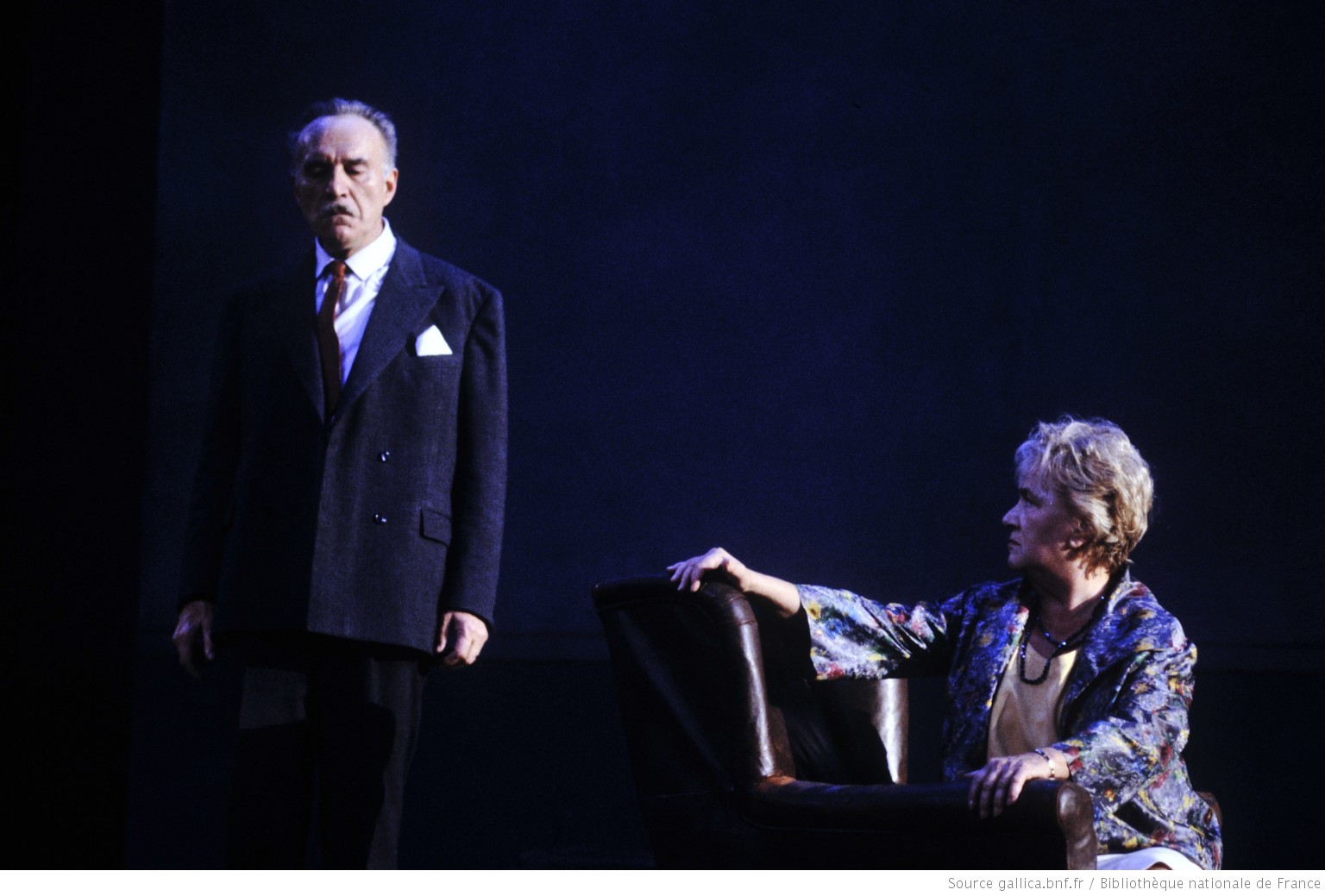 Rien de commun en apparence donc, entre Piccoli et Maillan, excepté cette immédiate évidence du jeu, comme son incarnation – mais sur deux pôles différents. Se détermine ainsi à travers ce couple, en amont de l’écriture, la portée double de la pièce ; double polarité – schématique – comique et dramatique. Le jeu sur les codes théâtraux s’exposerait donc d’emblée par le statut d’acteurs qui endossent en avant du jeu toute une tradition théâtrale, manière d’interprétation qui s’exécutera comme une lutte entre deux puissances du jeu, aux combats de figures qu’ils portent en eux.