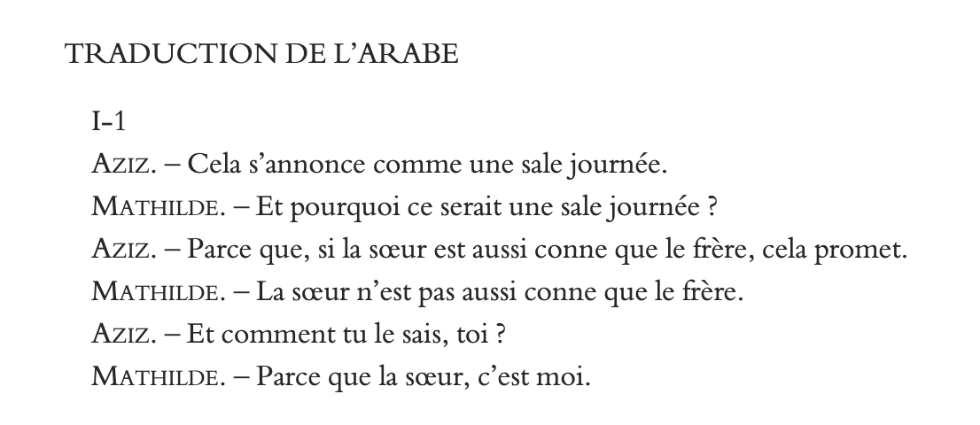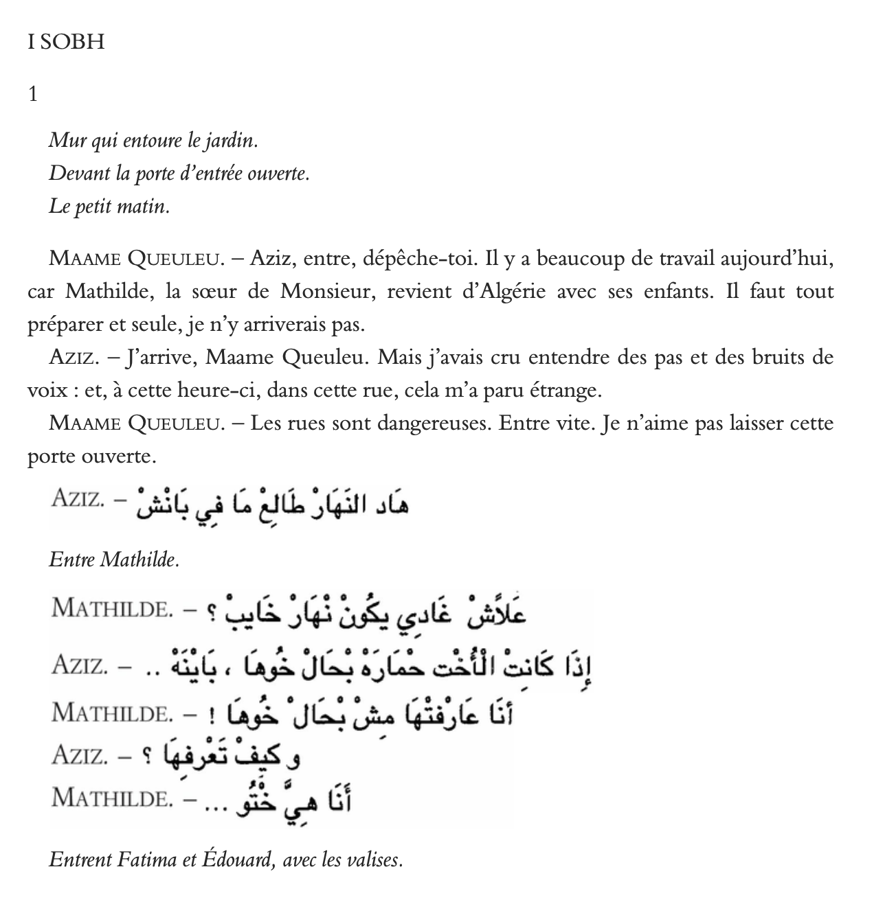 Qui est ce On, qui rit pour la seule raison qu’une langue étrangère, quelle cocasserie, et arabe qui plus est, comme c’est drôle, est parlée sur les planches d’un théâtre français, par l’actrice qui représente le théâtre populaire français ? Qui rit, mais le public français, parisien même, et un certain public, celui du Théâtre du Rond Point en bas des Champs Elysées, qui évidemment ne comprend pas l’arabe – ne comprend pas ce qui se parle dans cette langue, ceux qui parlent cette langue. Incompréhension qui est un moteur comique, et une désastre politique : « Je vous ai compris » est une antiphrase de mauvais acteur. Et qu’est-ce qui se dit :