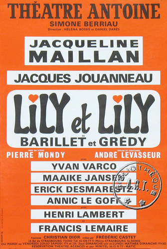Maillan, Picoli. Des retrouvailles qui pourraient être la trame d’un vaudeville : et c’est avant tout ce que va représenter le spectacle – ce que le vaudeville permet – : la rencontre moins de personnages que de deux acteurs. Ils sont issus de la même génération, ont été formés tous deux au cours Simon dans l’immédiat après-guerre, mais ont connu des trajectoires presque opposées et n’ont jamais joué ensemble. Maillan s’est liée à Pierre Mondy, et se fera rapidement connaître dans des pièces de boulevard où elle a imposé un style comique à distance, neutralisant le jeu pour mieux créer l’écart d’un rire au second degré. C’est ce jeu, équilibre entre retenue et exposition, réduction et efficacité, sobriété et puissance comique, qui est sa marque : « capable de tout jouer avec une sorte de distance complice », elle multiplie les rôles au cinéma et au théâtre. Cette distance lui donne la liberté de raconter par-dessus le texte sa relation avec le public des théâtres de la bourgeoisie qui aime se voir en miroir d’elle. En cela est-elle capable de tout jouer : de jouer sur tout et de faire jouer sur un texte même anodin ce regard à distance du texte qui le rehausse. De fait, elle joue surtout dans des vaudevilles à la mode, ceux de Barillet/Grédy (avant Lily & Lily, il y avait eu Le Chinois, 1958 ; Folle Amanda, 1971 ; Potiche, 1980…), ou de Marcel Mithois (elle triomphe notamment dans Croque-Monsieur en 1964, 1967, 1971 et 1974) : pièces écrites pour le jeu, c’est-à-dire elle seule, comme c’est elle seule que le public vient voir, non la pièce qui n’est qu’un prétexte.