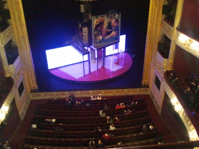 Double chiasme : Dumas pour parler de l’esclavage des corps au présent (une image au-dessus du plateau : Berlusconi dans les bras de Kadhafi — et un planisphère avec cette inscription qui tourne : anus mundi : l’abject politique contemporain) ; et Müller le contemporain qui parle de l’Histoire révolutionnaire passée. Au milieu de ce chassé-croisé, quelque chose qui tient moins de la transition que d’un miroir réfléchissant (sur nous) : le texte de Bataille, Histoire de l’œil — et quel rapport, au juste, de quelles forces ?