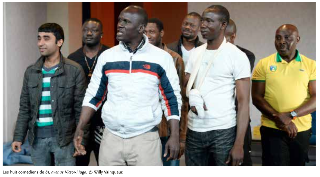 Accueilli avec enthousiasme par le public d’Aubervilliers lors de sa création au printemps 2015, 81, avenue Victor-Hugo l’est aussi par les pouvoirs publics. Le préfet délégué pour l’Égalité des chances, Didier Leschi, assiste au spectacle, qui semble le ravir : « C’est du théâtre militant plutôt bien fait. La mise en scène ne tombe pas dans le misérabilisme. Ces sans-papiers ne sont pas dans la pros- tration, ils ont créé une dynamique [10]. » Jugement esthétique qui se replie sur l’évaluation politique, et inverse- ment. Surtout, critique singulière qui sera décisive dans ce qui va se jouer dans les coulisses de ce théâtre. Le soir même, le préfet décide d’accompagner la démarche de ces comédiens ; il transmet le dossier au directeur du service de l’immigration, Jean-Pierre Sudrié. Ils étaient en France depuis huit, cinq ou trois ans, et militaient pour leurs droits, aidés par la mairie d’Aubervilliers depuis des mois : mais à la suite du spectacle, en quelques jours, ils reçoivent une convocation pour l’examen de leur dossier en vue de leur régularisation, que certains des huit sur le plateau obtiennent dès le 8 juin. Le 10 juillet, ils reçoivent leur carte de séjour. Mais les pouvoirs publics refusent la régularisation collective que réclament les quatre-vingts d’Aubervilliers. Le piège est partout : dans la logique discrétionnaire du « cas par cas » qui isole, distingue les réfugiés politiques des migrants économiques, comme s’il y avait chez les seconds un choix moins défendable ; distinction qui évacue la possibilité d’envisager globale- ment la situation d’ensemble — là où précisément la pièce voudrait faire entendre la force de trajectoires singulières, mais prises dans les mêmes tracés et engagés dans un même monde.